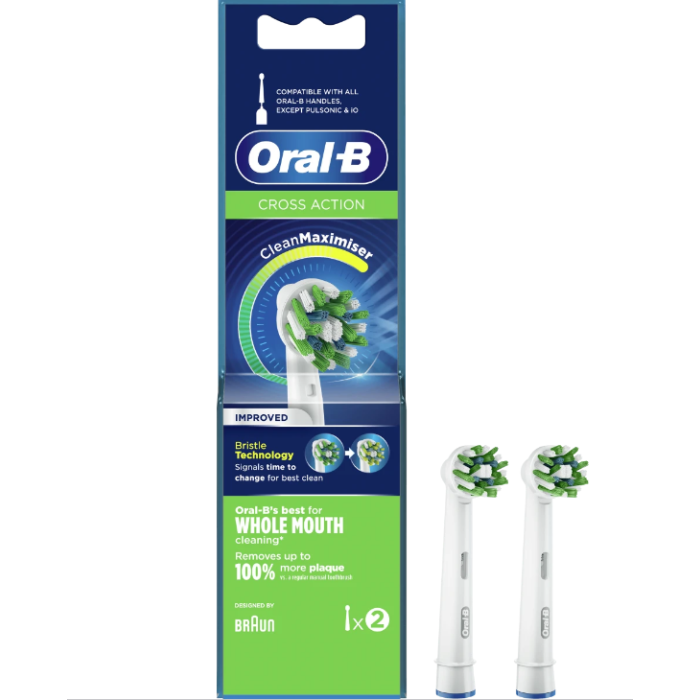 Накрайниците за електрическа четка за зъби Oral-B Cross Action Replacement Brush Heads имат прецизни ъгли, благодарение на които бактериалната плака се изчиства по-успешно. Премахват до 100% повече плака и замърсявания от ръчна четка за зъби. Влакната на Орал-Б Крос Екшън Накрайници за електрическа четка за зъби са разработени така, че да покриват повърхността на зъбите оптимално. Те достигат до труднодостъпните междузъбни пространства и почистват прецизно и ефективно устната кухина. Стоматолозите препоръчват накрайниците да се сменят на всеки три месеца. Подходящи са за електрически четки Oral-B PRO, TriZone и Vitality.