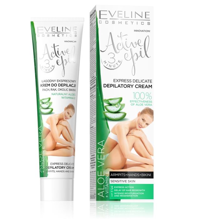 Експресен депилиращ крем за тяло - за чувствителна кожа и с 3 минутно действие с АЛОЕ ВЕРА. Ултра нежен крем за депилация, както на краката, така и на деликатни зони като подмишници, бикини или ръце. Ефективно и бързо премахва равномерното, дори най-късите косми, като действа максимално близо до фоликулите. Ултра подхранващ, изключително силен крем за депилация на тялото, също с чувствителна кожа. Ефективно премахва дори тъмните, твърди и устойчиви косми само за 3 минути. Използваната технология в новата серия Active Epil - NUTRI-EPIL FUSION ™, действаща директно върху космения фоликул, инхибира растежния им фактор, като по този начин значително забавя растежа на косъма, като намалява плътността и предотвратява растежа. Гаранция за максимално удължаване на ефекта на копринено гладка кожа и намалява честотата на процедура с депилация.