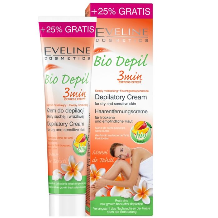 Експресен депилиращ крем за тяло - за суха и чувствителна кожа и с 3 минутно действие с био МАНГО ( манго отгледано в био контролирана среда ). Ултра нежен крем за депилация, както на краката, така и на деликатни зони като подмишници, бикини или ръце. Ефективно и бързо премахва равномерното, дори най-късите косми, като действа максимално близо до фоликулите. Ултра подхранващ, изключително силен крем за депилация на тялото, също с чувствителна кожа. Ефективно премахва дори тъмните, твърди и устойчиви косми само за 3 минути. Формулата действа директно върху космения фоликул, инхибира растежния им фактор, като по този начин значително забавя растежа на косъма, като намалява плътността и предотвратява растежа. Гаранция за максимално удължаване на ефекта на копринено гладка кожа и намалява честотата на процедура с депилация.