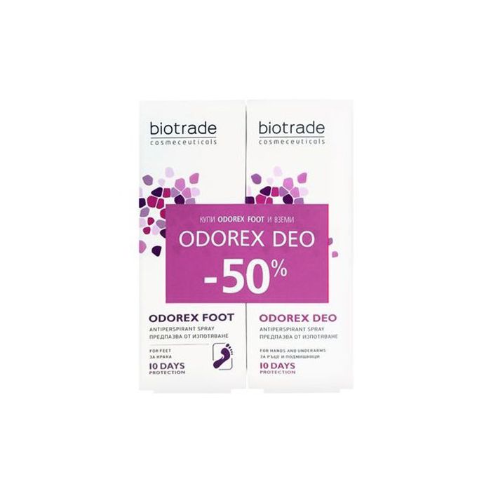 1. БИОТРЕЙД ОДОРЕКС ФУУТ СПРЕЙ ЗА КРАКА ПРОТИВ ИЗПОТЯВАНЕ 40 млOdorex Foot спрей против изпотяване и неприятна миризма на крака, който осигурява 10 дневна защита само след едно нанасяне. Съдържа съставка, която предпазва от неприятна миризма.