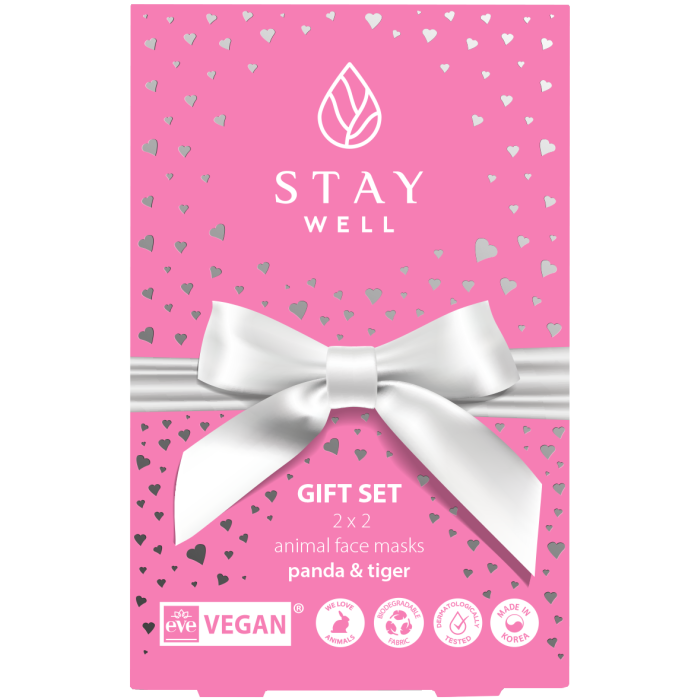 STAY Well Vegan Animal masks – Tiger: Aqua (Water), Glycerin, Methylpropanediol, PEG/PPG-17/6 Copolymer, Centella Asiatica Extract, Polyglutamic Acid, Origanum Vulgare Flower/Leaf/Stem Extract, Polygonum Cuspidatum Root Extract, Scutellaria Baicalensis Root Extract, Camellia Sinensis Leaf Extract, Glycyrrhiza Glabra (Licorice) Root Extract, Chamomilla Recutita (Matricaria) Flower Extract, Rosmarinus Officinalis (Rosemary) Leaf Extract, Aloe Barbadensis Leaf Extract, Sodium Hyaluronate, Sodium Acetylated Hyaluronate, Hydrolyzed Hyaluronic Acid, Dipotassium Glycyrrhizate, Panthenol, Allantoin, PEG-60 Hydrogenated Castor Oil, Xanthan Gum, 1,2-Hexanediol, Hydroxyacetophenone, Disodium EDTA, Butylene Glycol, Phenoxyethanol, Parfum.