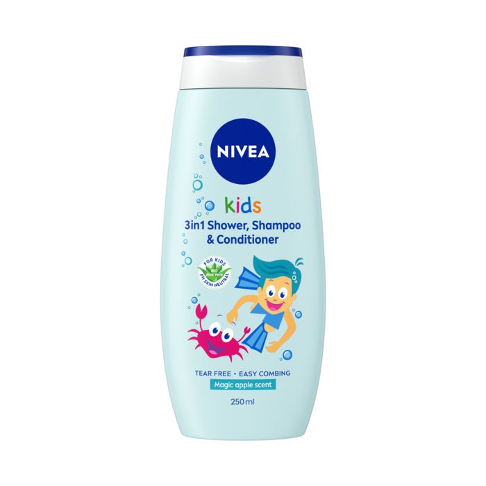 NIVEA Детски душ-гел и шампоан за момчета - съдържа БИО алое вера, нежно почиства и се грижи за деликатната детска кожа и коса. Не дразни очите и спомага за лесното разресване на косата.