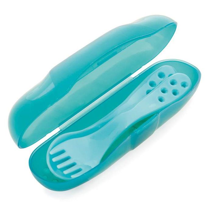 Комплект прибори за пътуване запазва приборите на детето чисти. Предлагат се в три цвята: син, зелен, розов.