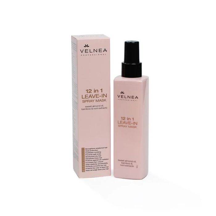 Спрей маската без измиване Velnea 12in1 е специално формулирана за употреба върху всички типове коса. Обогатен с масло от сладък бадем и кератин, както и екстракти от бамбук и нони за комплексна грижа и за най-взискателната коса. / Спрей маската без измиване Velnea 12in1 е специално формулирана за употреба върху всички типове коса. Обогатен с масло от сладък бадем и кератин, както и с растителни екстракти от бамбук и нони за комплексна грижа и за най-взискателната коса. / Velnea 12в1 Спрей маска без отмиване е специално формулирана за използване върху всички типове коса. Обогатен с масло от сладък бадем и кератин, както и екстракти от бамбук и нони за комплексно подхранване на най-фината коса.