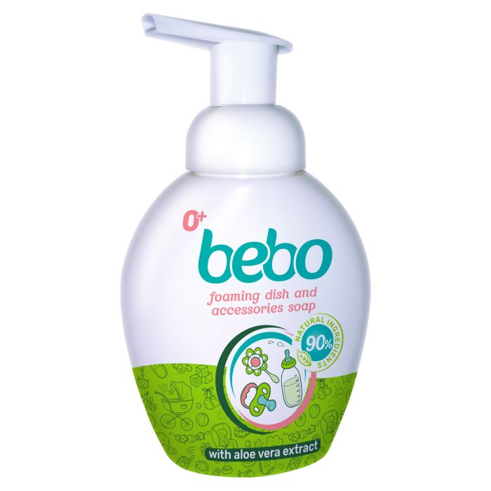 Пяна за бебешки съдове и аксесоари bebo измива без остатък храна и замърсявания от биберони, залъгалки, шишета, миещи се играчки като същевременно се грижи за кожата на ръцете.