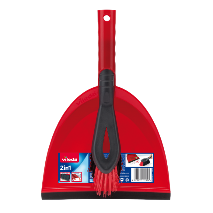 Комплектът за метене 2 в 1 от Vileda е практичен помощник в домакинството. Улеснява ежедневното почистване и премахва напълно трохи, прах и други замърсявания от пода. Интелигентната ръчна четка 2 в 1 съчетава ултратънки черни косъмчета с твърди червени косъмчета. Това означава, че улавя дори най-фините частици прах и влиза във всеки ъгъл. Благодарение на гумената си устна, лопатката лежи близо до пода, така че мръсотията може да се прехвърли удобно върху нея.