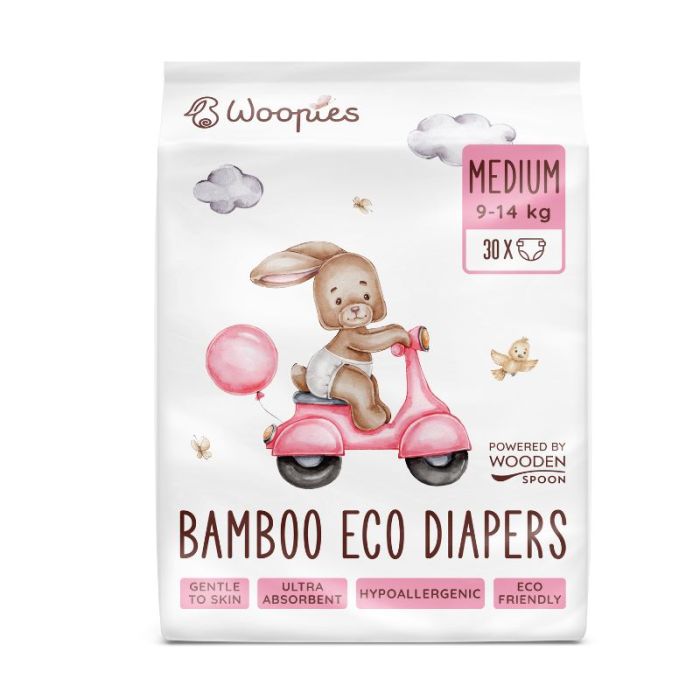 Меки като бамбуково бельо, пелените Woopies обгръщат бебето с несравнима грижа от естествени тъкани, които помагат бебешката кожа да диша свободно. Външната част на пелената е направена от 100% тъкан бамбук (биоразградим) и гладък филм от царевично нишесте (биоразградим). Вътрешната част е комбинация от бамбукови нишки (биоразградими) и мембрана, която вкарва влагата навътре в пелената, за да пази бебешкото дупе сухо (не е биоразградима). Пълнежът е от биоразградима дървесна целулоза и супер-абсорбиращ Японски полимер (не е биоразградим). Woopies са ново поколение пелени, създадени от WoodenSpoon и вдъхновени от всички майки, които не спират да търсят екологично решение за бебетата си в името на едни по-здрави дечица и една по-чиста планета*. Добре дошли в новия свят на Woopies! Обичани от бебетата! Одобрени от родителите! Оценени от природата! *Една стандартна пелена се разгражда в рамките на 450 – 500 години. В оптимални условия, за 85 дни, пелените Woopies са вече разградени над 50%.