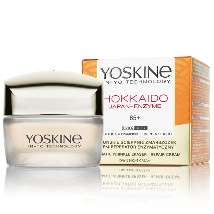 Учените на YOSKINE R&D развиват IN-YO TECHNOLOGY, която действа върху кожата на две нива. Първо IN’DETOX технологията почиства токсините в кожата, подготвяйки я да абсорбира активните съставки. След това YO’ACTIVE помага приемането на активните съставки в кожните клетки. Резултатът е млада и регенерирана кожа.JAPANESE WRINKLE ’ERASING’ – дневен и нощен ензимен възстановяващ крем за 65+. Има анти-ейдж, възстановяващи, лифтинг свойства и премахва тъмни петна придобити от стареене.HOKKAIDO’ BIOENZYME – FERMENT: Естествен ензим от тиква с нежни ексфолиращи свойства, получен чрез процес на ферментация. Използван ежедневно, той идеално изглажда кожата, действа дори върху дълбоките бръчки „изтривайки“ ги от повърхността на кожата.SOY&YOUTH PEPTIDE: Активен комплекс от соево масло и Tetrapeptide-7, които изпълват кожата и изглаждат в дълбочина. Силните възстановяващи свойства подпомагат повдигането на овала на лицето и изглаждат бръчките в дълбочина.FERULIC ACID&BIO-OIL: Феруловата киселина, комбинирана с подхранващо био масло. Хидратира и изравнява тена, елиминирайки петна причинени от слънцето и тъмни петна причинени от стареене.