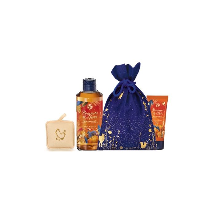 YVES ROCHER POMMES D'HIVER Подаръчен комплект душ гел 400 мл + крем за ръце 75 мл + гъба за баня + сатенена торбичка