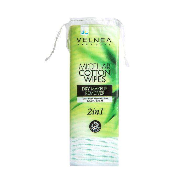 Velnea микеларни памучни тампони - Памучни тампони, активирани с вода, могат да се използват както за почистване на лицето, така и за премахване на грим. Съдържат витамин E, екстракт от алое и морков. Не е необходимо изплакване.
