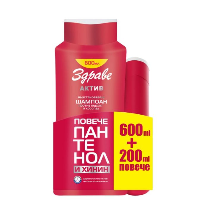 ЗДРАВЕ АКТИВ Шампоан за коса с пантенол и хинин, 600+200мл.
