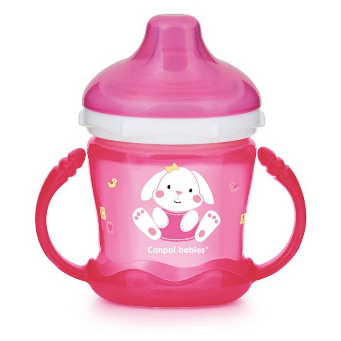 Нетечащия накрайник помага на детето да пие самостоятелно от чашата без опасност от разливане на течност. Капачката защитава накрайника от замърсяване. Удобните широки дръжки позволяват лесно хващане и държане на чашата. 230мл, 9м+. Предлага се в два цвята: син и розов.